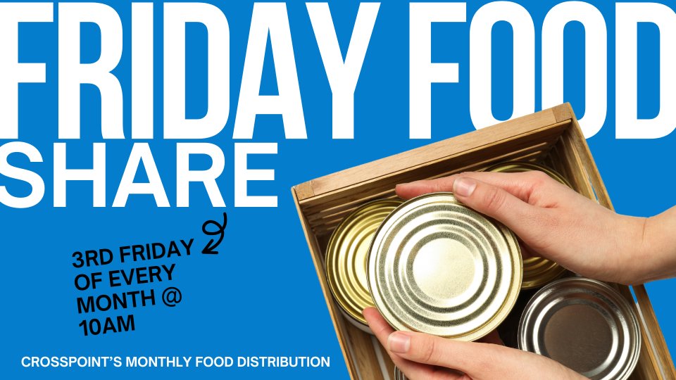Friday Food Share, CrossPoint’s monthly food distribution, will begin at 10 am FRIDAY morning, 4/17. Recipients should provide a recent rent receipt or utility bill to verify residency in 74063, as well as a valid ID. Supplies are distributed, first come, first served, while they last. The line for distribution can be located in the west parking lot of our campus.