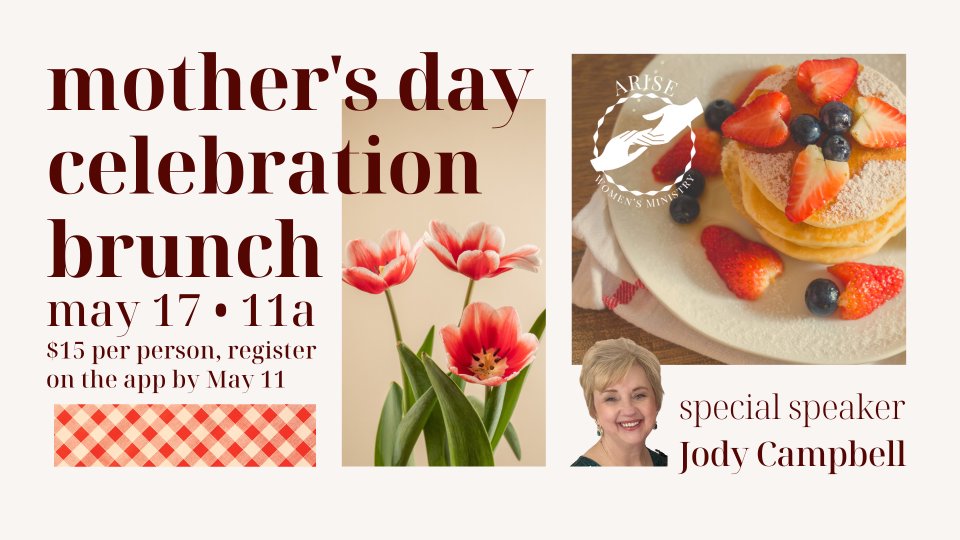 This year's Mother's Day celebration will happen after Mother’s Day on May 17 from 11:00am to 2:00. Brunch will be served at church. Cost is $15 per person (kids 10 and under are free).