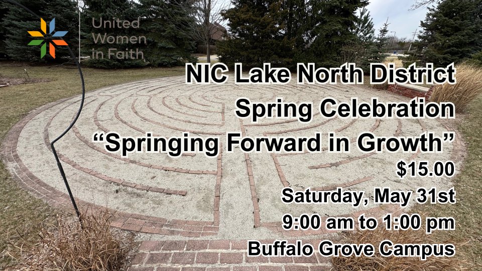 The UWFaith NIC Lake North District will have its Spring Celebration: "Springing Forward in Growth" on Saturday, May 31st from 9:00 am to 1:00 pm at Kingswood United Methodist Church, Buffalo Grove campus. The cost is $15.00. (scholarships available) The presenters will be Laura Dean Friedrich and Charlotte Wyncoop. Registration can be found on the UWFaith website, http://www.uwfaithnic.org