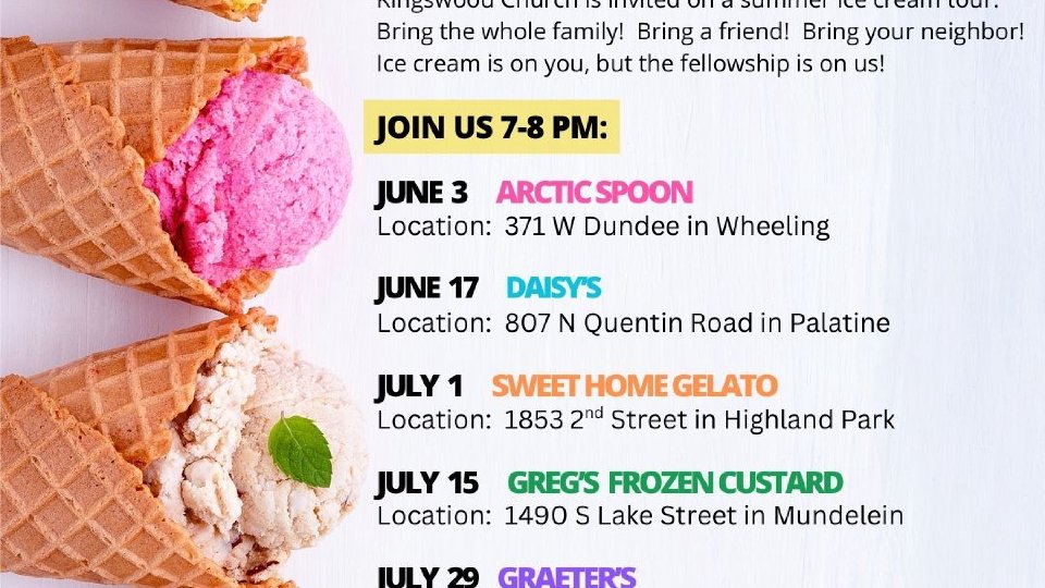 Kingswood Church is invited on a summer ice cream tour. Bring the whole family! Bring a friend! Bring your neighbor! Ice cream is on you, but the fellowship is on us!