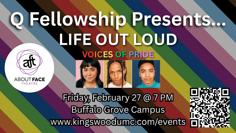 Join us for an exciting time to live Life Out Loud with the Q Fellowship! We welcome the About Face Theatre to Kingswood as they bring their production, Life Out Loud: Voices of Pride, written by Dionne Addai (they/she) on Friday, February 27, at 7:00 pm at our Buffalo Grove campus.