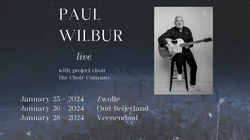 Join Paul Wilbur on a worship tour in three amazing cities in the Netherlands! SCHEDULE: Thursday January 25, 2024: 8:00 PM - Zwolle Resurrection Church, Bachlaan 150, 8031 HL Friday January 26, 2024: 8:00 PM - Oud-Beijerland EGHW, Polderlaan 1, 3261 ZA Sunday January 28, 2024 - 8:00 PM - Veenendaal De Basiliek, Wiltonstraat 56, 3905 KW