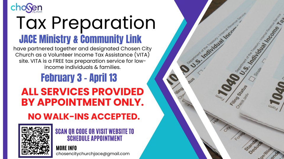 The JACE Ministry has partnered with Community Link for the 3rd year to offer free tax preparation services at Chosen City Church through the IRS Volunteer Income Tax Assistance (VITA) program. The VITA program generally services individuals with an income of $60,000.00 or less. ALL TAX PREPARATION SERVICES ARE PROVIDED BY APPOINTMENT ONLY. NO WALK-INS ARE ACCEPTED. Learn more about VITA program and other available tax preparation sites by visiting the following site: https://www.communitylinknc.org/pages/%20vita
