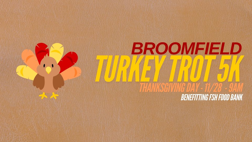 Welcoming all runners, walkers, and pumpkin pie eaters alike! This fall event is fun for the whole family. Youth and team pricing is available! All the details you could ever need are right here on this site! Click the "race info" tab up top and scroll/click through the options to learn more! The Broomfield Turkey Day also hosts a food drive for Broomfield FISH! Learn more about our charity partner and find out what items they currently need! When you bring 5 items to donate on race day, you'll be entered into a raffle for prizes from 3W Races and our sponsors!