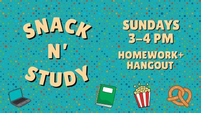 Snack N Study is the perfect midweek pause — a time for students to unwind, grab a snack, and focus together before the busyness of life sets in again. Whether you need a quiet corner to catch up on homework, a little extra help from friends, or just a place to recharge, you’ll find community, laughter, and encouragement here. Everyone is welcome — bring your books, your questions, and your appetite!