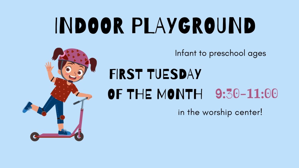 This is a monthly indoor playground for those with preschool age and younger kids. Come escape the rain and play in our worship center! We will have bikes and trikes and more! We will meet in the worship center.