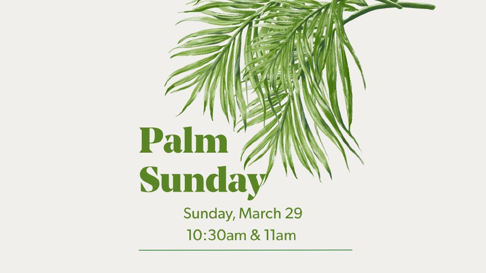 Come celebrate the triumphant entry of Jesus this Palm Sunday with us at either 10:30am, 11:00am or online. As we mark the beginning of Holy Week and journey toward the cross, we will wave palms and our children choirs will sing at the 11am service. All children and their parents are invited to gather in the narthex at 10:50 am for the Palm Procession in the Sanctuary.