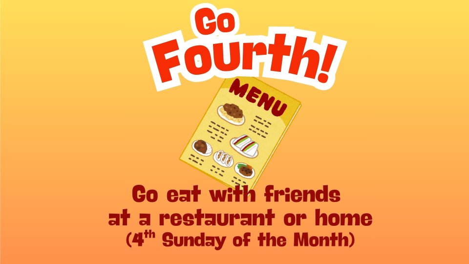 Every 4th Sunday, make plans to eat with friends out at a restaurant or invite folks over for a meal at your home!