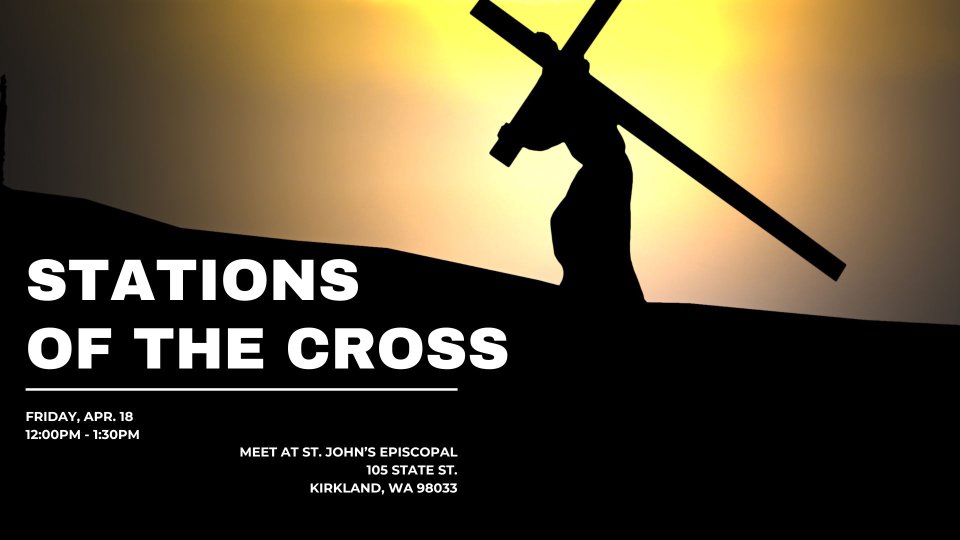 The Stations of the Cross is an ancient Good Friday tradition, marking Jesus’ journey through Jerusalem toward his crucifixion. Together with other Kirkland churches, we join for a walk through downtown Kirkland, stopping to offer short prayers as we mark each station. The walk begins at noon at St. John’s Episcopal Church in Kirkland and ends at Marina Park at approximately 12:00pm. Join us for all or part of the walk as you are able. (The walk does take place in all weather, so dress warmly!)