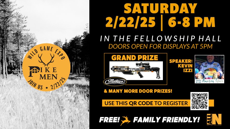 Join the Wild Game Expo 2025, hosted by the Men's Ministry! This exciting and family-friendly event features guest speaker Kevin Izzi. Doors open at 5PM for displays, where you can bring a deer for scoring and showcase your best setups.
