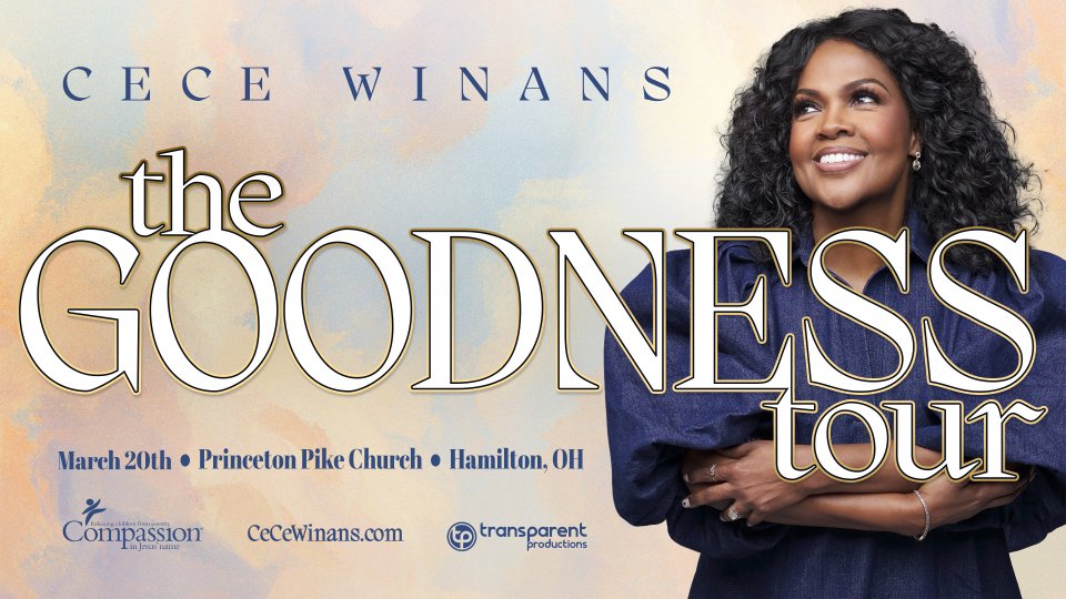 LIVE at Princeton Pike Church in Hamilton, OH on March 20, 2024 --------------------------------- ON SALE NOW! --------------------------------- SCHEDULE (subject to change): 5:30 PM - VIP doors 5:45 PM - Early Entry doors 6:00 PM - General Admission doors 7:00PM - Concert Begins --------------------------------- CeCe Winans’ The Goodness Tour is an all new worship experience that will feature the biggest songs from CeCe’s album, Believe For It and debut brand new songs that will release in April, including Holy Forever and many other new surprises. --------------------------------- For the protection of our ticket buyers and event participants, third party selling of tickets will not be permitted for any Transparent Productions event pages. There has been an increase in fraudulent and unlawful scams around concert ticket sales online. To ensure everyone has an official ticket to the event through proper channels, we recommend you purchase your tickets through the official ticketing outlet for your event. Any purchases through 3rd parties or 3rd party ticketing sites are not guaranteed by Transparent Productions and limits your ability to receive up to date information for the event and any necessary assistance. See less