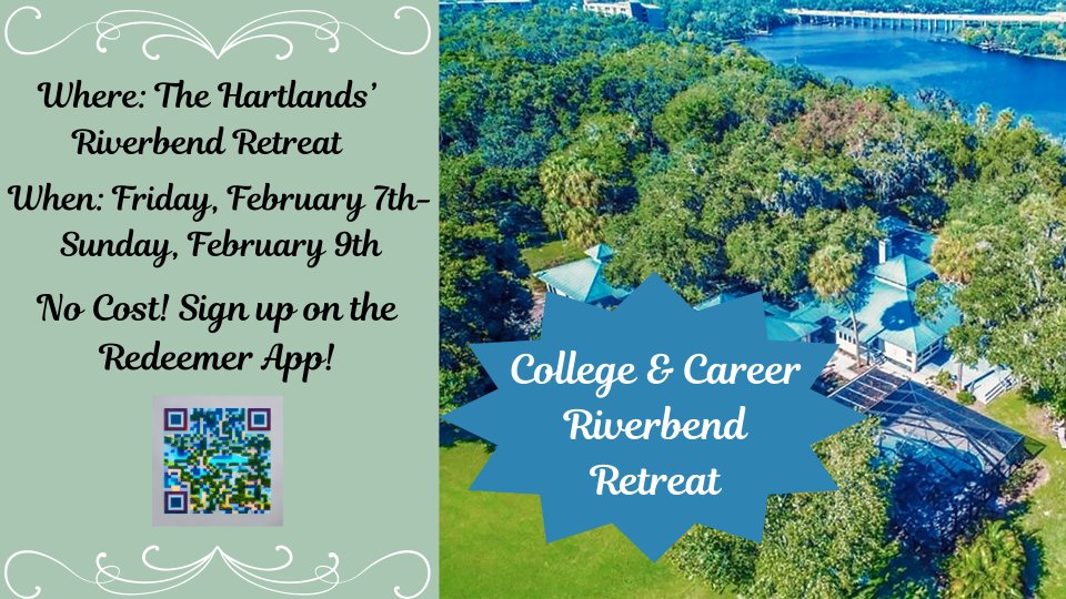 Register today for Redeemer's College and Career Ministry's annual Winter Retreat at the Hartland's Riverbend Retreat! Join us for a weekend of Worship, Fellowship and Rest.