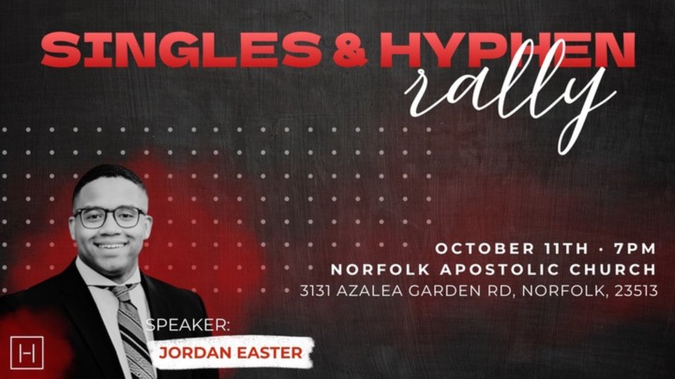 Join the singles of the Virginia district for a rally at Norfolk Apostolic church with Rev. Jordan Easter on Friday, October 11th at 7PM.