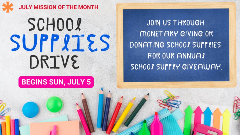 Our annual back to school supplies drive is here! Join us through monetary giving or donating school supplies from a list of items in need. Please include/select "mission of the month" description in your online/in-person monetary donations.