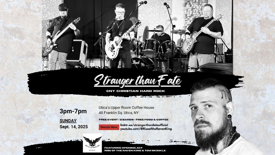 Our next coffee house event at Utica's Upper Room features our very own Stranger than Fate with opening act Rise of the Raven King & Tom Skinkle.