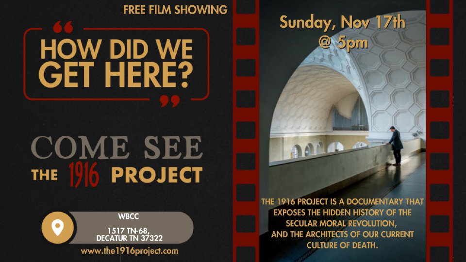 Join us for a free film screening! The 1916 Project is a documentary that exposes the hidden history of the secular moral revolution, and the architects of our current culture of death.