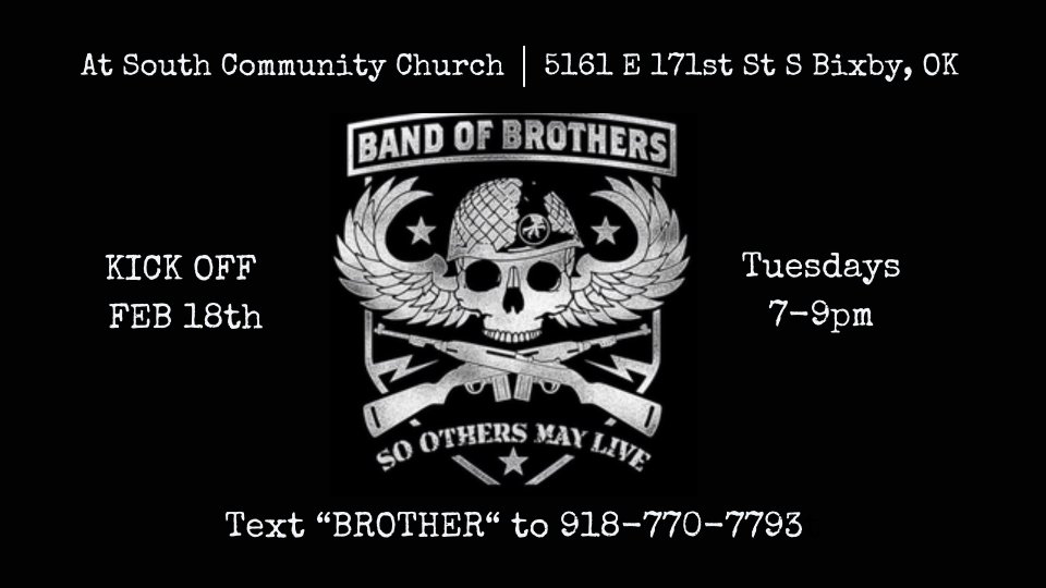Men, the next wave of Band of Brothers is starting on Tuesday, February 18th, at 7PM in the CLC. Text “BROTHER” to 918-770-7793 to sign up.