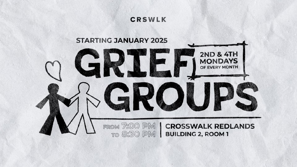 Starting in January 2025, our Grief Group will meet regularly on the 2nd and 4th Mondays from 7-8:30 at Crosswalk Church in Redlands. We will meet at 7:00 PM in Room 1 near the Worship Center. There will be a sign-up link, and I will forward it to this group email as soon as it is available. We look forward to learning, supporting, healing and growing together. Blessings to you all!