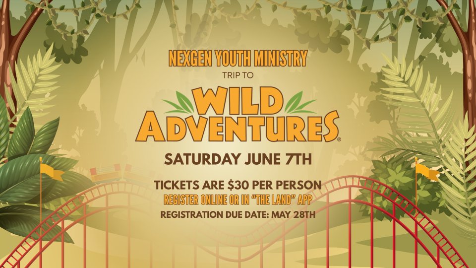 Hey NexGen Family—it’s time for a ROAD TRIP! We’re heading to Wild Adventures on Saturday, June 7th for a day full of fun, thrills, and fellowship. The cost is only $30, and the last day to register is Wednesday, May 28th.