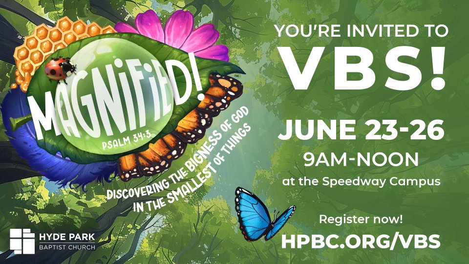 Join us June 23-26 at HPC (3901 Speedway) for Magnified VBS! This week will encourage kids to look closely at the details of God’s amazing world and magnify, or proclaim, the greatness of God. God made us, cares about us, loves us, forgives us, and is faithful to keep all His promises to us. We can praise God together! We were made to magnify God!