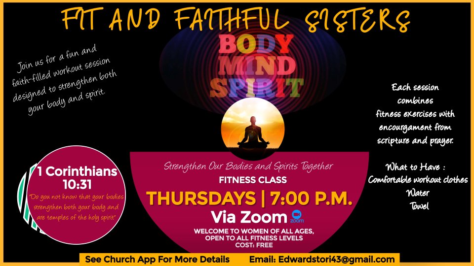 Join us for a fun and faith-filled workout session designed to strengthen both your body and spirit. Each session combines fitness exercises with encourgament from scripture and prayer.