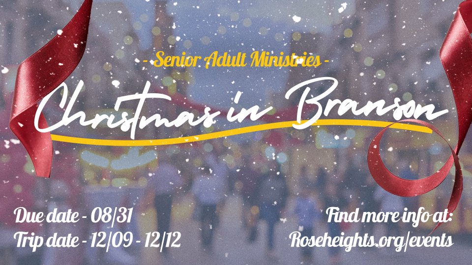 Join us for an exciting trip to Branson from December 9-12! To secure your spot, a $150.00 deposit is due by August 31st. Register online at roseheights.org