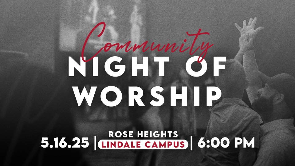 Join us at 6:30 PM at the Lindale campus for Community Night of Worship! We’re coming together to build a unified worship culture in our area, and you're invited. Special guests Brett & Amanda Bell from UPPERROOM will lead us in an unforgettable night of worship. Enjoy the food truck, grab some coffee, and connect with your community. All are welcome — We can't wait to worship with you!