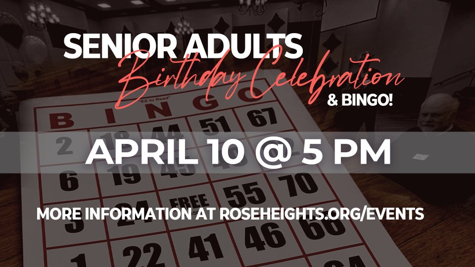Join us for a great evening as we celebrate our Rose Heights Senior Adults with April birthdays! Enjoy a delicious meal, birthday cake, bingo & fun fellowship. Don’t miss this chance to honor and connect with our senior community.