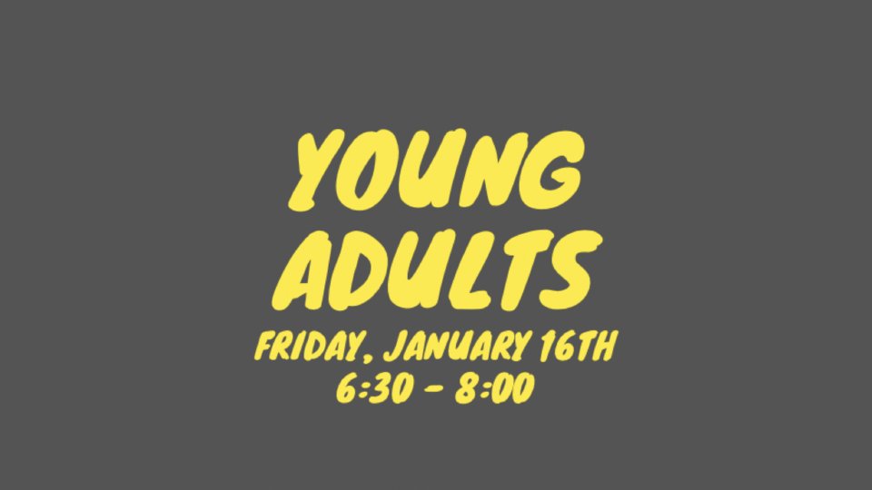 Hey young adults, mark your calendars for Friday, January 16th from 6:30 - 8:00! This ministry is for adults in their 20's (18+). Engaged, single or married? All are welcome but there is no child care provided! We'll see you then!