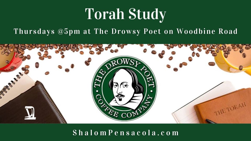 Join us for our weekly Torah Study at 6:30 pm at The Drowsy Poet coffee shop on Woodbine Road (aka Coffee Break Cafe). Each week, we discuss the current Torah Parsha and what we gleaned from it. Please see an updated reading schedule on the home page of our website to know what to study.