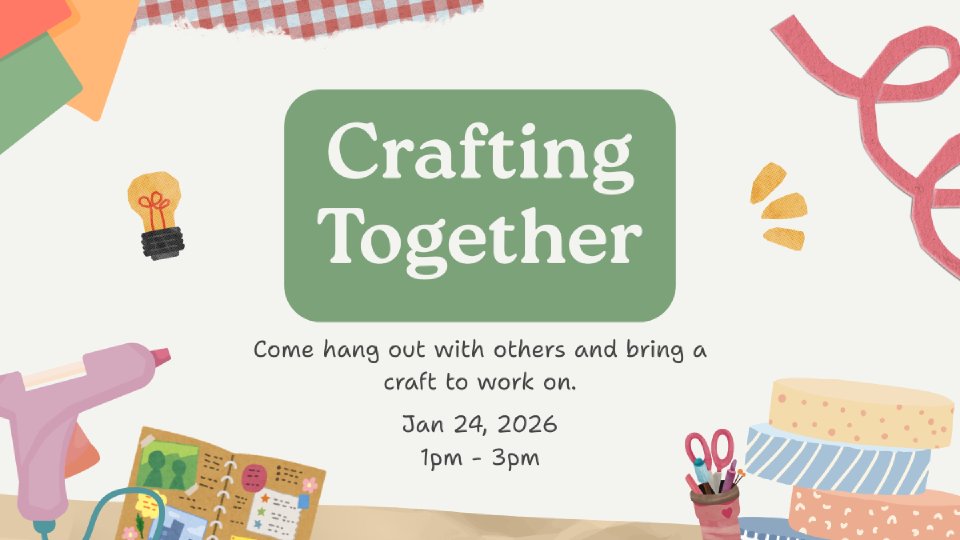 Come hang out with others and bring a craft to work on. From crochet or color by numbers, do what you love while enjoying company. Everyone is welcome! Feel free to bring a snack to share.