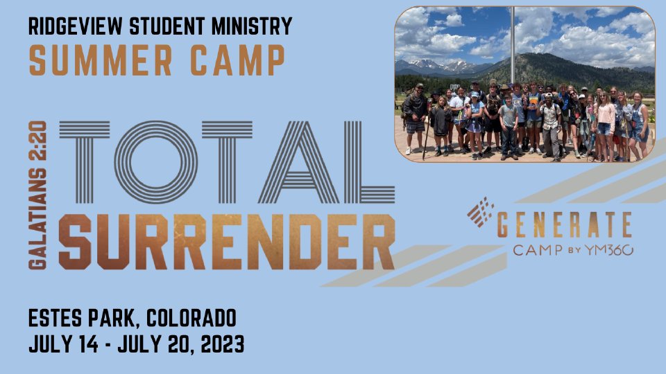 The bus to Colorado is full! Please register your student on the waiting list (link below) and if any spots come open, we will contact you. Dates: July 14-20, 2024 For students in grades 7 through 12 Cost: $635 total, $100 deposit reserves your spot. Fundraisers between now and July will happen to help offset the cost for students who participate. We are taking our students to an amazing camp in Estes Park, Colorado! It will be July 14 - 20th. We take an overnight charter bus to one of the most beautiful locations in the USA! Our students will go to sleep watching movies in Texas and wake up in beautiful Estes Park on the edge of the Rocky Mountain National Park! The theme for camp this year is "Total Surrender." Students are going to learn what it means to fully give their lives to God and why God can be trusted with every area of our lives.