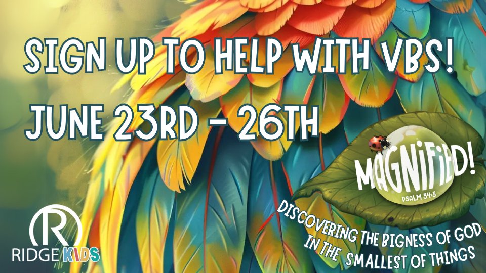 Ridge Kids thanks you for stepping up to serve at VBS this year. We are so thrilled that you chose to answer this call. VBS is a HUGE community outreach, and it takes over 100 volunteers to make it happen. Just by signing up you are helping fulfill the mission of Ridgeview Church to Win - Disciple - Send.