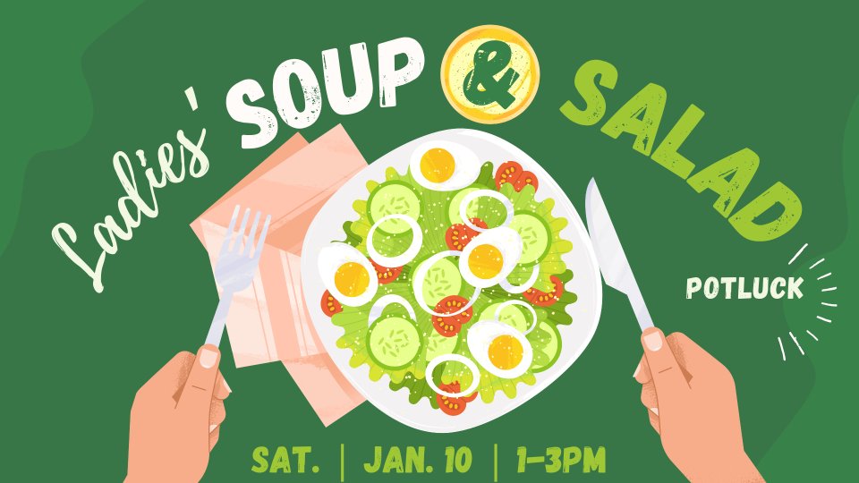 Calling all ladies 10 years old and up! Nothing hits the spot on a chilly day like a warm bowl of soup! 🥣 Join us for a cozy afternoon of fellowship and a potluck filled with everyone’s favorite soups and salads. Bring a friend (or two!), your best appetite, and a container for those delicious leftovers!