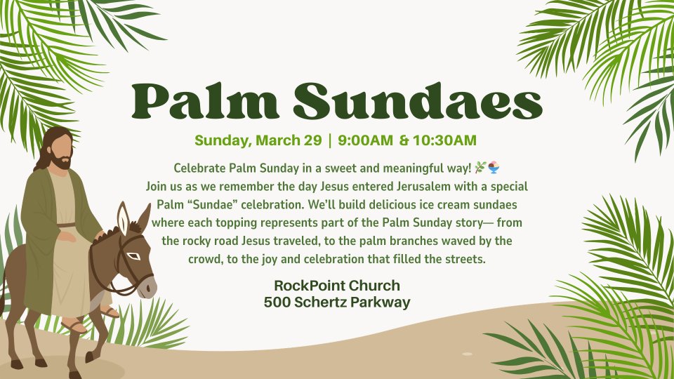 Join us as we remember the day Jesus entered Jerusalem with a special Palm “Sundae” celebration. We’ll build delicious ice cream sundaes where each topping represents part of the Palm Sunday story. From the rocky road Jesus traveled, to the palm branches waved by the crowd, to the joy and celebration that filled the streets.