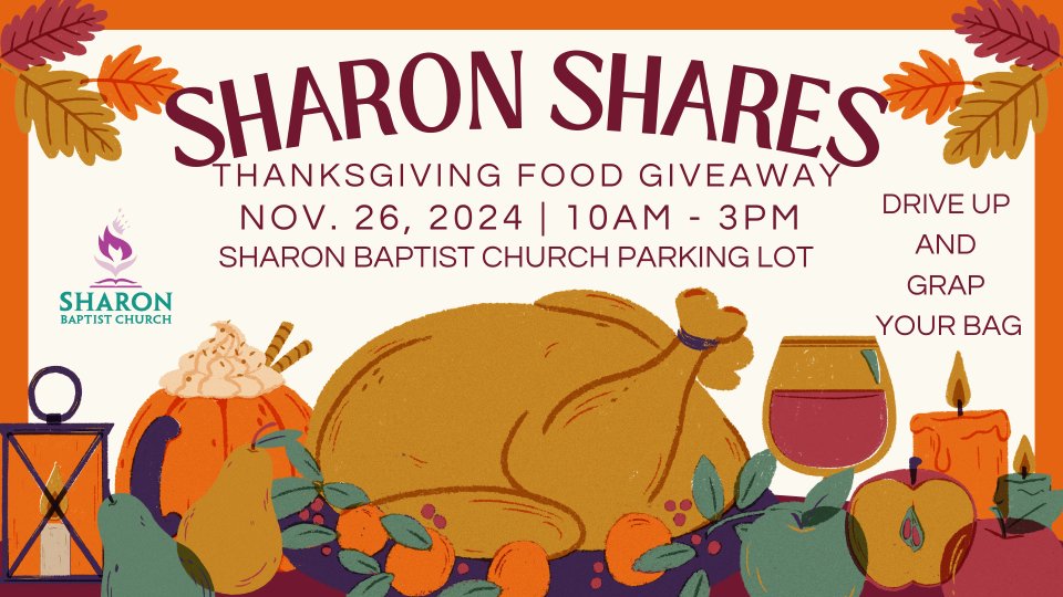 This Thanksgiving season, Sharon Baptist Church invites you to be a blessing and receive one too! Join us for the Mission Ministry’s Sharon Shares Thanksgiving Food Giveaway on Tuesday, November 26, from 10 AM to 3 PM. Just drive up to the Sharon Baptist Church parking lot and grab your free Thanksgiving bag, filled with all the essentials to make your holiday meal special! Whether you're in need or just want to share the joy of Thanksgiving, we welcome you with open arms and full hearts. Come by, no strings attached, and let us help make this Thanksgiving a little brighter. Again, that’s Tuesday, November 26, from 10 AM to 3 PM at Sharon Baptist Church. We’ll see you there!