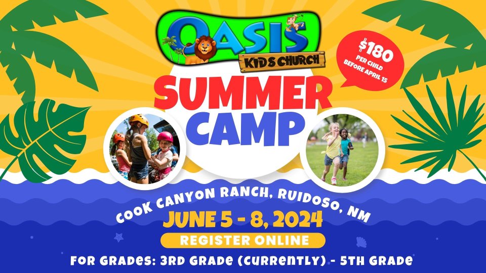 Oasis kid's church will be taking a group of 30 kids up to church camp at Cook Canyon Ranch in Ruidoso, NM! Here's the scoop: Who: 3rd grade(currently)- 5th grade What: Kids Camp When: June 5-8 Where: Cook Canyon Ranch, Ruidoso, NM Why: To connect with Jesus Cost: $180 We are so pumped to be able to love on and be intentional with a smaller crowd this summer. I really think God is going to transform lives and your kiddo is going to be able to experience Christ Jesus like never before! Camper Deadline Costs Until April 15 >> $180 Until May 6 >> $190 After May 6 >> $210 Final Registration Deadline >> May 29 If you’d like more info on the camp and if you want your child to attend, here's what to do: Click on the link to Register At the camp website click “Register Here” Select our church: Alamogordo-Christ Community Church Make sure to select KIDS CAMP 3: June 5-8 Then register your child! There is a $20 registration fee due immediately