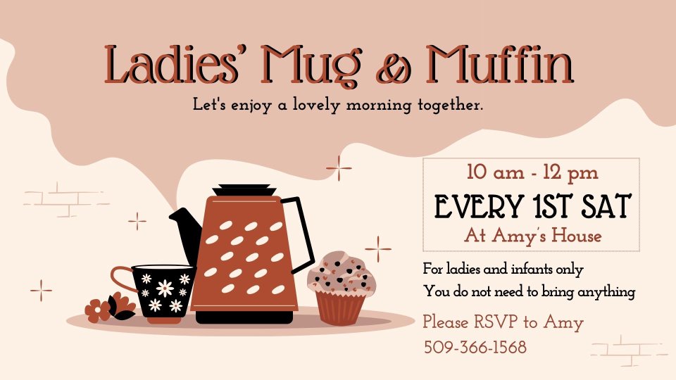 For ladies (and infants, no kids) to enjoy a morning together over muffins and their beverage of choice every first Saturday of the month at Amy Meyer's house. Everything provided by the host, Amy. Please contact Amy to get her address and to RSVP 509-366-1568.