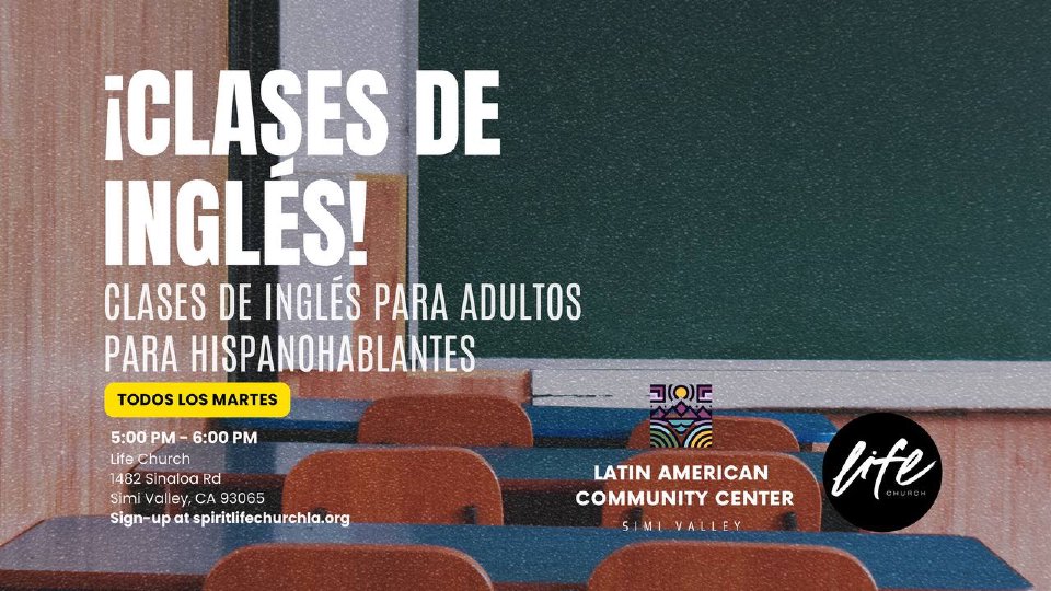 Exciting news from the Latino Community Center Simi Valley Chapter! Each Monday, we're rolling out our free ESL classes for the vibrant Latino community of Simi Valley. Held in the welcoming halls of Life Church, these sessions are a testament to the spirit of inclusivity and the supportive role the church plays in our collective advancement. With Simi Valley's significant Latino population, the need for accessible language education has never been clearer. Our classes are designed to empower you with English proficiency, opening doors to new opportunities and enhancing community connections. Join us in this enriching experience and let's grow together. Your future in English starts here!