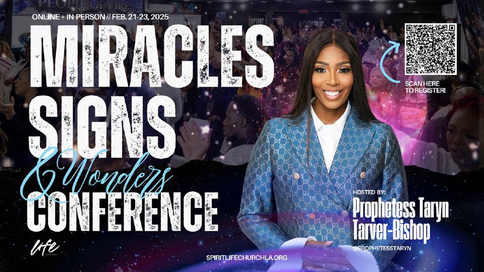 Experience the supernatural at Miracles, Signs, and Wonders 2024, hosted by Prophetess Taryn N. Tarver-Bishop at Spirit Life Church in Simi Valley, CA. Witness cancers healed, chronic pain vanish, and miraculous deliverance in Jesus' name. Learn how to operate in the supernatural as you're equipped for miracles, signs, and wonders.