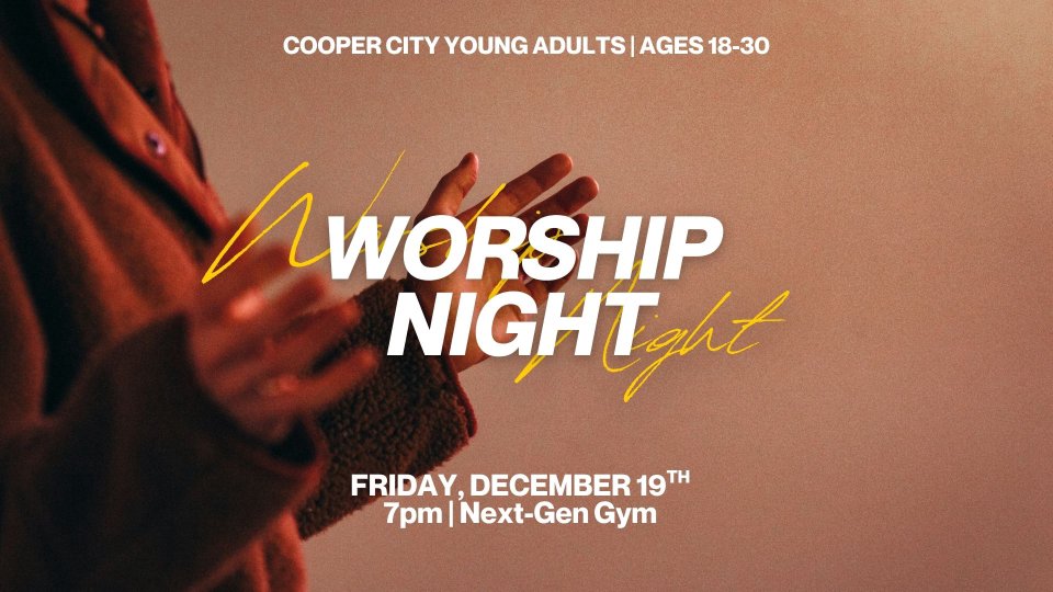 Cooper City Young Adults (ages 18-30), you're invited to join us on Friday, December 19, at 7pm as we close out 2025 with a powerful Night of Worship!