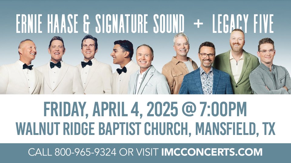 Award-winning quartet, Ernie Haase & Signature Sound, as they take the stage here at The Ridge for a second year in a row! They'll be joined by their special guests, Legacy Five, bringing you an exciting night of worship and music that you won’t want to miss! Get your tickets now at iTickets.com or through the Walnut Ridge website and App.