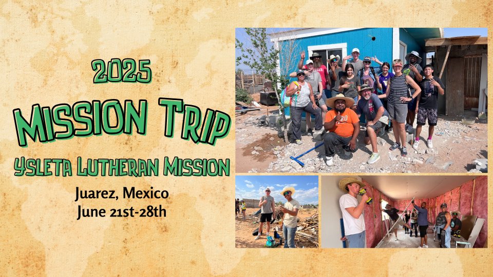 Need to renew your passports? Get ready for an unforgettable week of serving and sharing the love of Jesus! Our 2025 Mission Trip is set for June 21-28, working with Ysleta Lutheran Mission, and we’d love for you to be part of the team. We will be building a house and leading a women's ministry in Juarez, Mexico. To secure your spot, register today with a $100 non-refundable deposit. Limited Spots are available! We have a special fund set up to collect donations to help support this mission trip. Please go to sjdenver.org/give to donate!