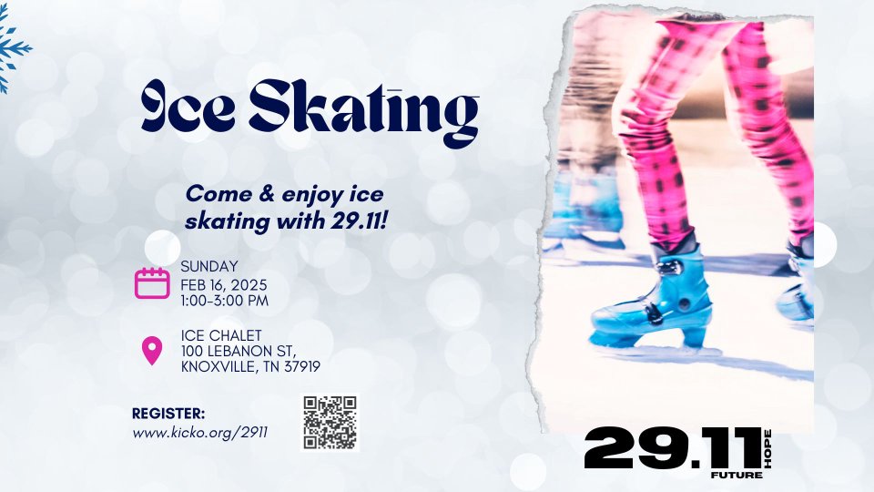 29.11 invites all foster/adoptive/kinship TEENS (11-18) to join us for some ICE SKATING! We will meet at the Ice Chalet (100 Lebanon St, Knoxville, TN 37919) at 1 p.m. on Sunday, February 18th for a couple of hours of skating fun. Please register ONLY for foster/adoptive/kinship TEENS (11-18) attending. Your entire family is more than welcome to stay and skate if you like. 29.11 has sponsorships for the TEENS only. Regular admission is $7.50, plus $7.50 skate rental.