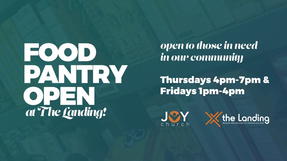 Food Pantry at The Landing Our food pantry will be open on Thursdays from 4pm-7pm. If you or someone you know needs a little assistance with food, it would be our honor to serve you! Please stop by at any time between 1pm-4pm, no appointment necessary. Pantry hours at Joy Church | Thursdays 4pm-7pm | Fridays 1pm-4pm