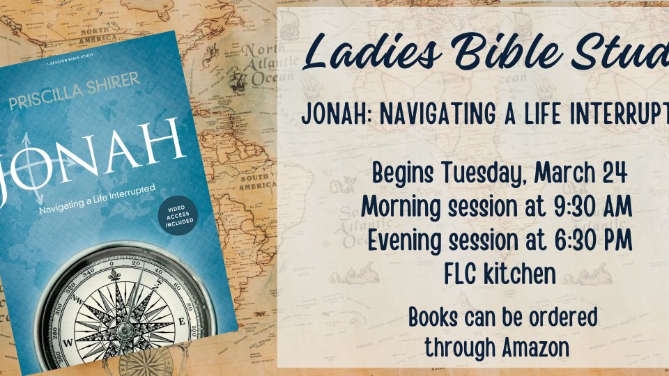Ladies, our new Bible study begins Tuesday, March 24. It will meet in the Family Life Center at 9:30 AM and again at 6:30 PM, so you can choose the time that works best for you. The study for this session is Jonah, Navigating a Life Interrupted by Priscilla Shirer, and you can order your book on Amazon. Do not miss this opportunity to connect with other ladies, grow in God’s Word, and be encouraged as you study together.