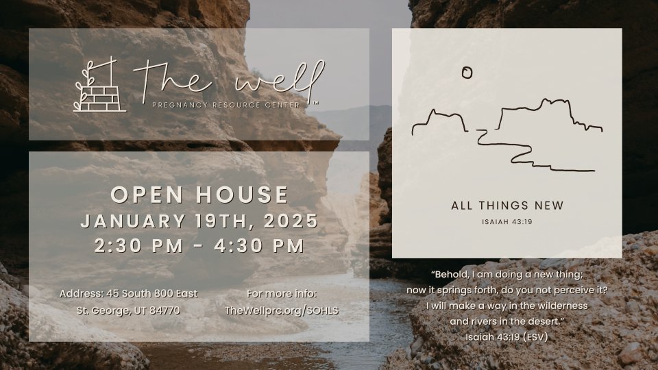 In honor of the Sanctity of Human Life Sunday, “The Well” is hosting an open house at their new location. Please join them for a tour of their center, learn about how they serve the community, enjoy light refreshments, and fellowship with like-minded individuals. The address is 45 South 800 East, St. George. Please park in the Red Mesa Fellowship parking lot and walk around to the northern Client Entrance.