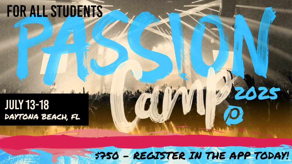 Summer will be here before you know it, and we are THRILLED to invite your students to attend Passion Beach Camp 2025! Our middle and high school students will journey to Daytona Beach, Florida to have the time of their lives!!! July 13th through 18th, students will experience world class teaching, worship, and beach FUN. We KNOW these spots are going to go FAST, so secure your students spot today for the best week ever!!!