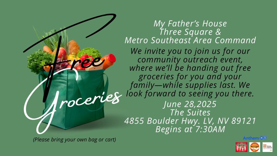 My Father's House Church, Three Square & Metro Southeast Area Command invite you to join us for our outreach event, where we'll be handing out free groceries for you and your family while supplies last. We look forward to seeing you there. Please bring own bag or cart.