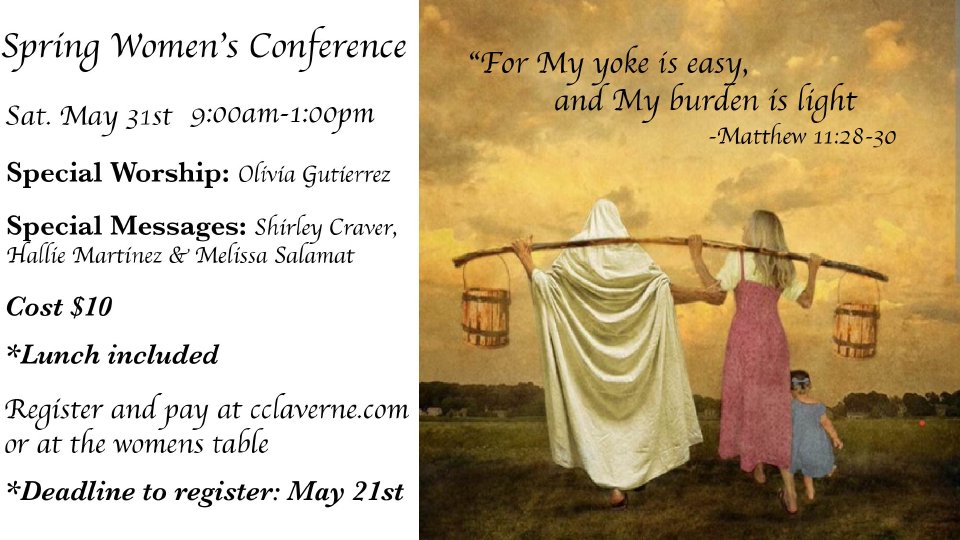 The Women's ministry is hosting a Spring Women's Conference Saturday, May 31st from 9am-1pm in the sanctuary. Join us for a special time of worship and bible study. The cost is $10 and includes lunch. Register, at cclaverne.com and pay through Zelle, (Office@cclaverne.com) or see us at the Women's table after service.